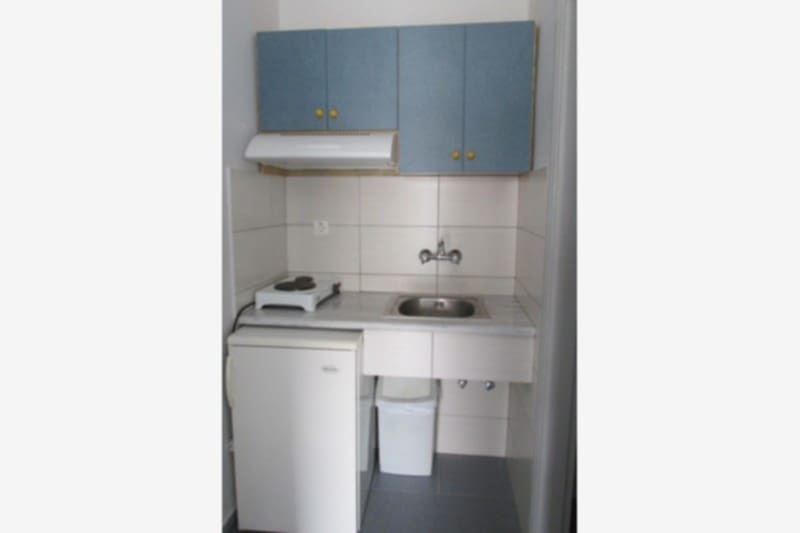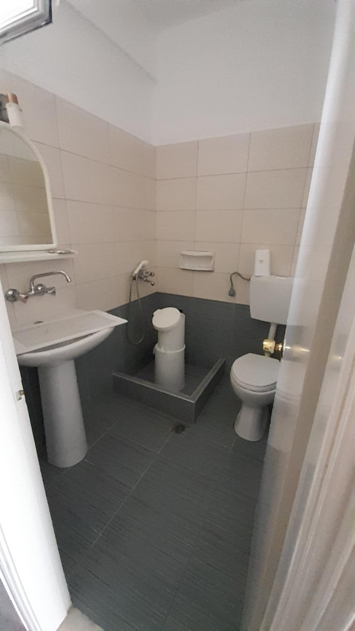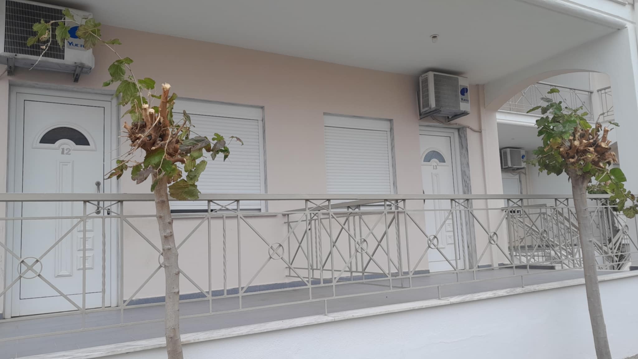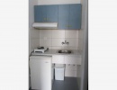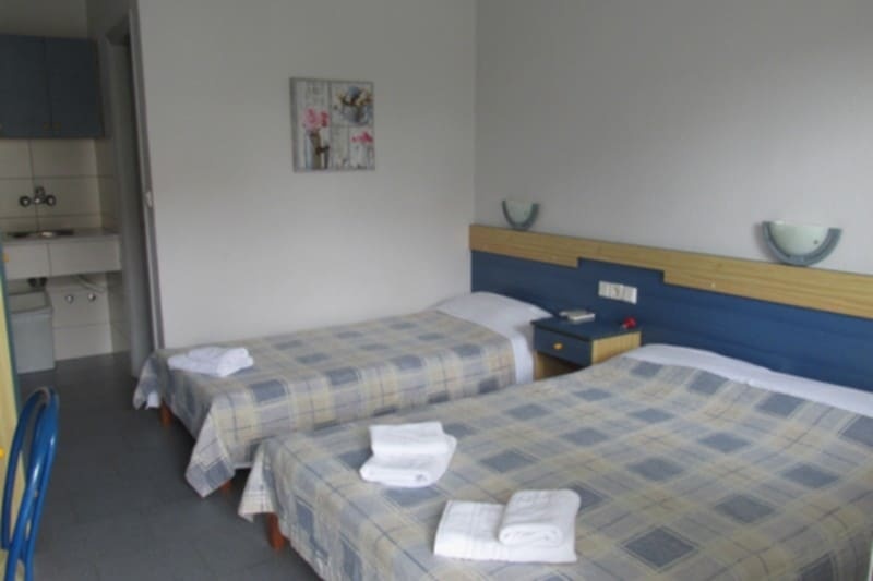Трокреветно студио на високо приземје кое има еден дупли и еден единечен кревет, мебел, телевизор, клима уред. Во истата просторија се сместени елементите од кујната (електрично решо со две рингли, аспиратор, фрижидер со мала комора, основни садови за готвење и јадење). Студиото има сопствено купатило со нормална големина. Студиото располага со пространа тераса која има поглед кон улицата, опремена со пластична маса и столчиња. Терасата е поврзана (со преграда) со терасата на студиото бр. 13.