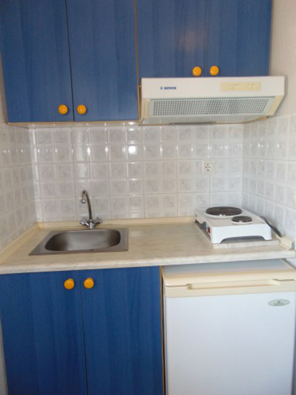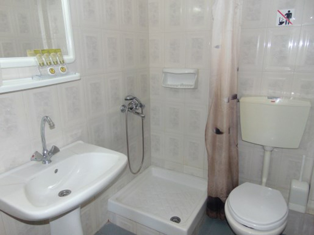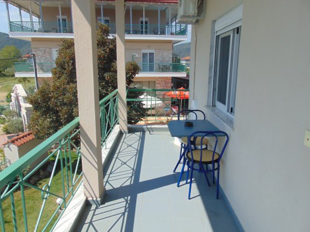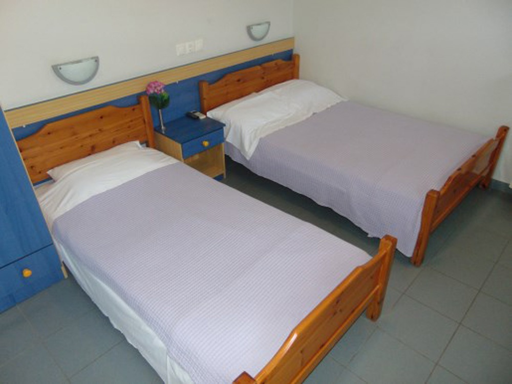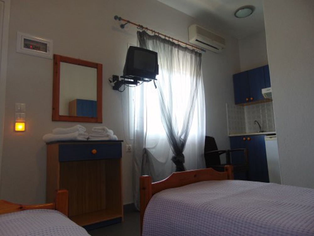 Трокреветно студио на прв спрат кое има еден дупли и еден единечен кревет, мебел, телевизор, клима уред. Во истата просторија се сместени елементите од кујната (електрично решо со две рингли, аспиратор, фрижидер со мала комора, основни садови за готвење и јадење). Студиото има сопствено купатило со нормална големина. Студиото располага со тераса со пластична маса и столчиња која има поглед во дворот на хотелот и кон паркингот, како и бочно кон базенот.