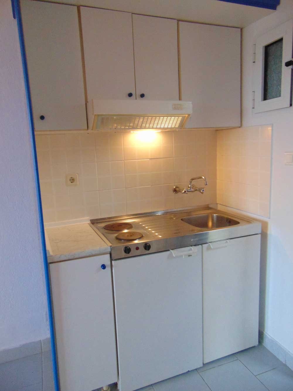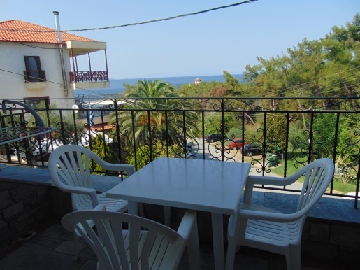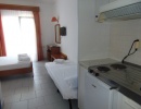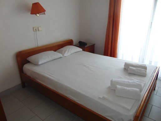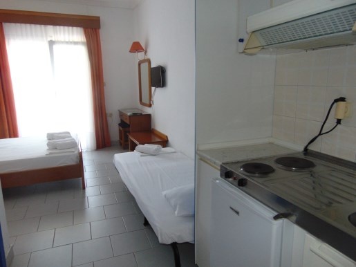 Двокреветно студио на високо приземје кое има еден дупли кревет и еден помошен кревет со нормални димензии (во ценовникот студиото е назначено како 1/2+1) Опремено е со мебел, телевизор, клима уред. Во истата просторија се сместени елементите од кујната (електрично решо со две рингли, аспиратор, фрижидер со мала комора, основни садови за готвење и јадење). Студиото има купатило со сопствен бојлер.Терасата е со нормална големина, опремена е со пластична маса и столчиња и има поглед на море. Напомена: Приземјето е на исто ниво со терасата на хотелот.